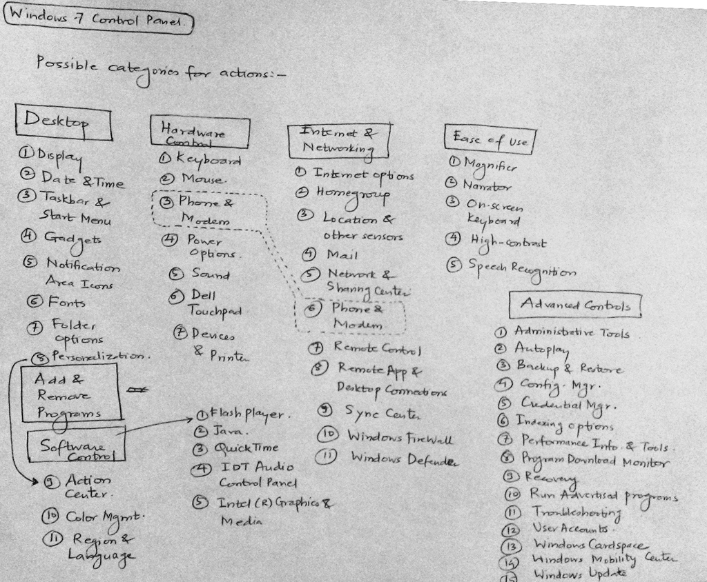 This is an attempt to redesign the Windows 7 Control Panel. The first image shows a mash-up of a mind map or decomposition of an action in Windows desktop.